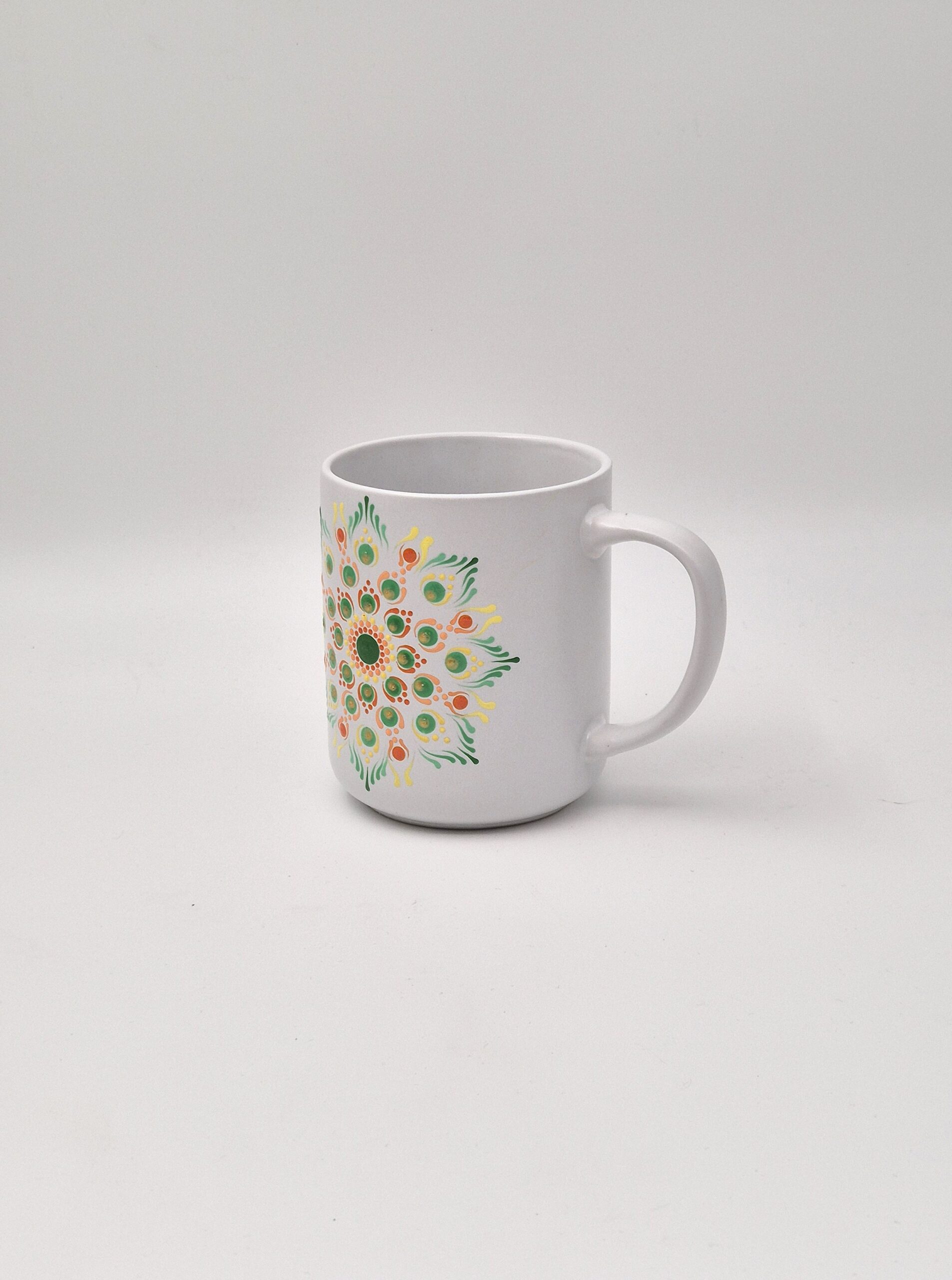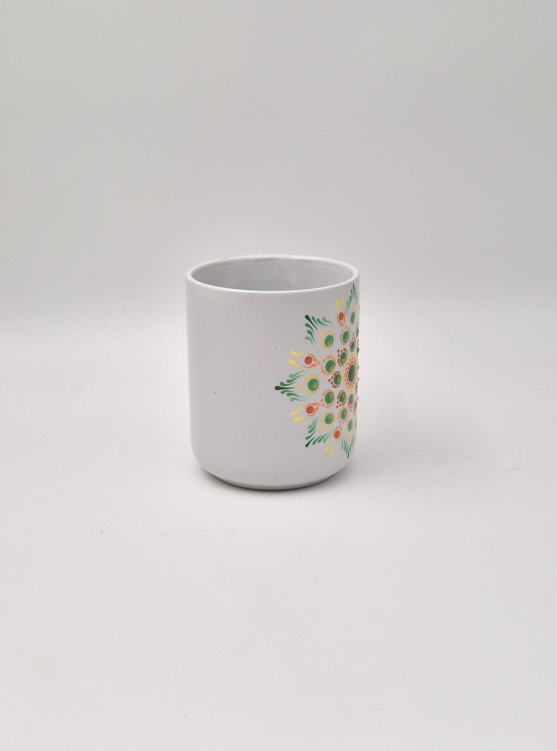 Ta unikatni lonček je ustvarjen, da v vaš vsakdan prinese ravnovesje in pomiritev. Mandala v zelenih in rumeno-rdečih odtenkih simbolizira Srčno čakro (Anahata), ki je središče sočutja, zdravljenja in ljubezni. Zelena barva prinaša mir in rast, medtem ko rumeno-rdeči detajli v sredini krepijo vitalnost in toplino srca. Uporabite ga za vaš ritual prizemljitve, za spodbujanje pozitivne energije in hvaležnosti. Čudovito darilo za vsakogar, ki išče mir in notranjo obnovo.