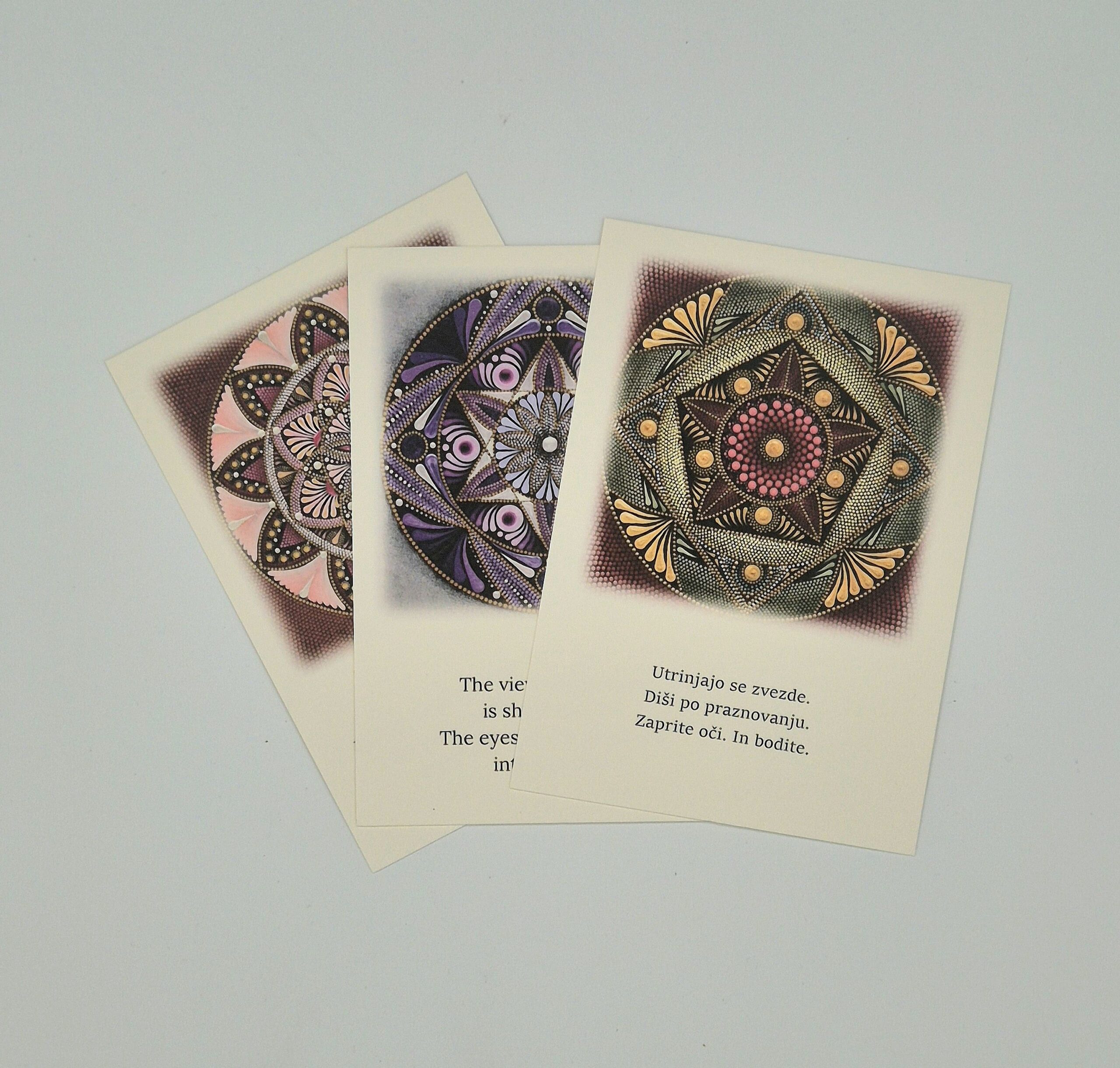 Na kartolinah Čarne srčnice sva uravnotežili frekvence mandal in kratkih besedil – lepih misli navdiha. Oblikovali sva jih z odgovornostjo in iskreno željo, da vam prinesejo darove Dobrega: zdravje, mir, srečo, ljubezen, navdih, obilje, radost, prijaznost, sočutje, blagost… Da vas objamejo s toplino in vam polepšajo trenutek, dan.