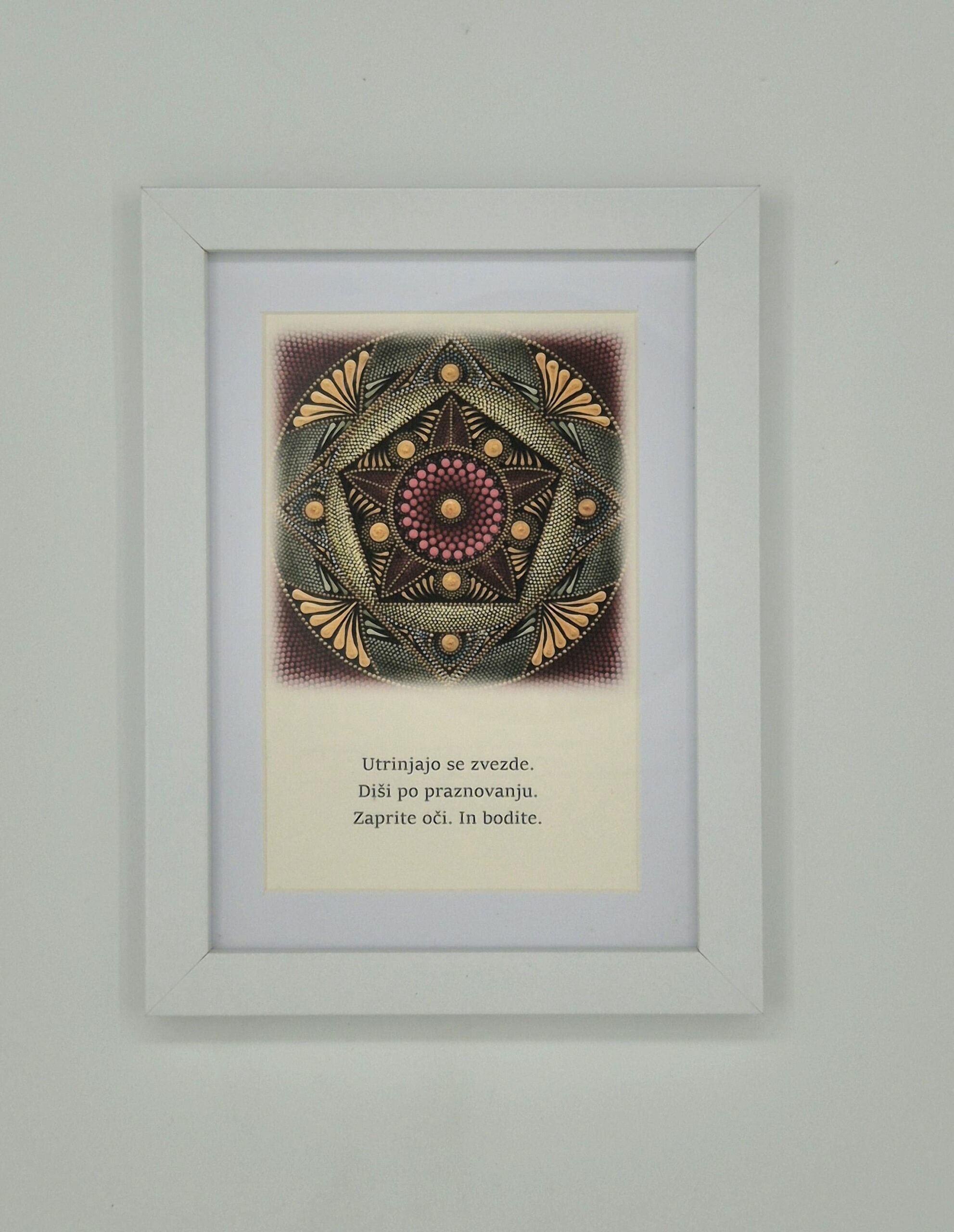 Mandale so ročno naslikane v tehniki pointilizem in ustvarjajo mozaik energije in ravnovesja, obogatene so z numerološkim zapisom in posebnim namenom. Umetniške kreacije nežno prenašajo sporočilo in energijo, zato so primerne za polepšanje vašega doma ali kot darilo z globokim pomenom. Oblike, barve in besede imajo svojo frekvenco, s katero lahko vplivamo na naše boljše počutje, razpoloženje, energijo prostora…