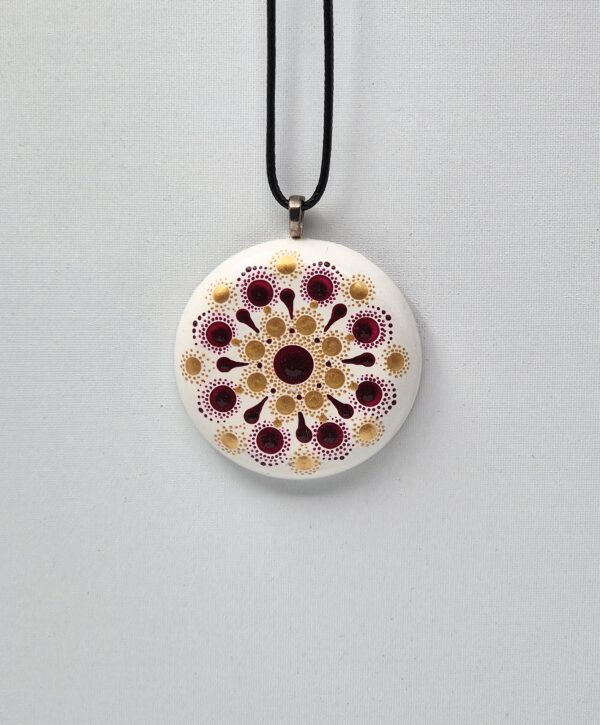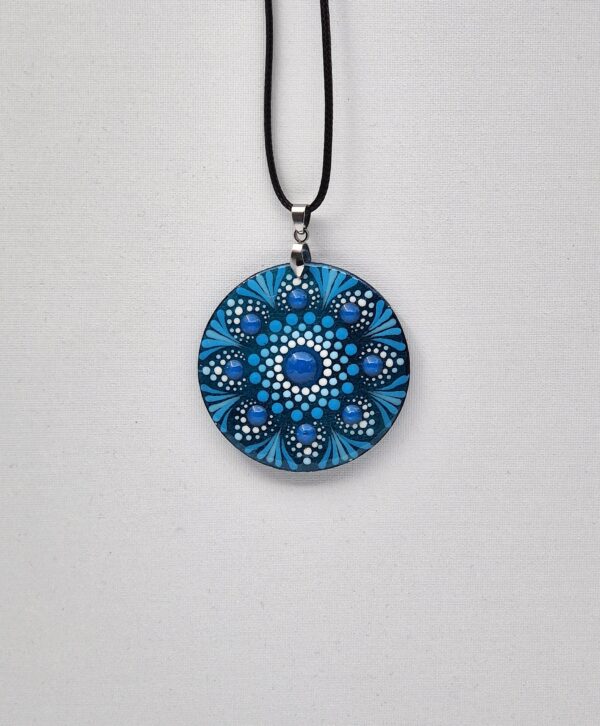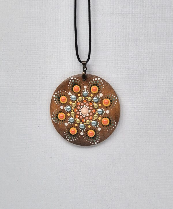 - Obesek: Leseni krog (premer 2,5 cm) je ročno poslikan z akrilnimi barvami (Dot Art) in skrbno nameščen v elegantno srebrno osnovo.