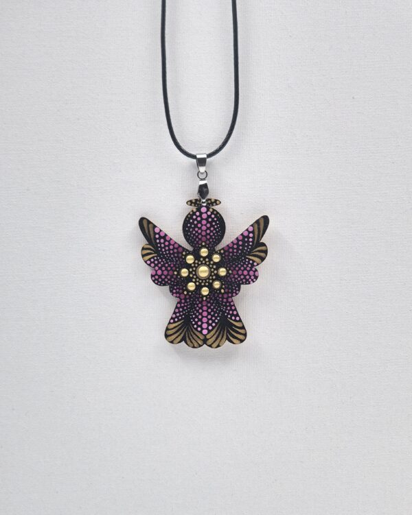 Ročno naslikana lesena ogrlica Muca Intuitivne Ljubezni – Mandala (Vijolična/Roza) v srebrni osnovi. Talisman za spiritualno ljubezen, sočutje in intuicijo (Kronska/Srčna čakra). Premer mandale je 2,5 cm.