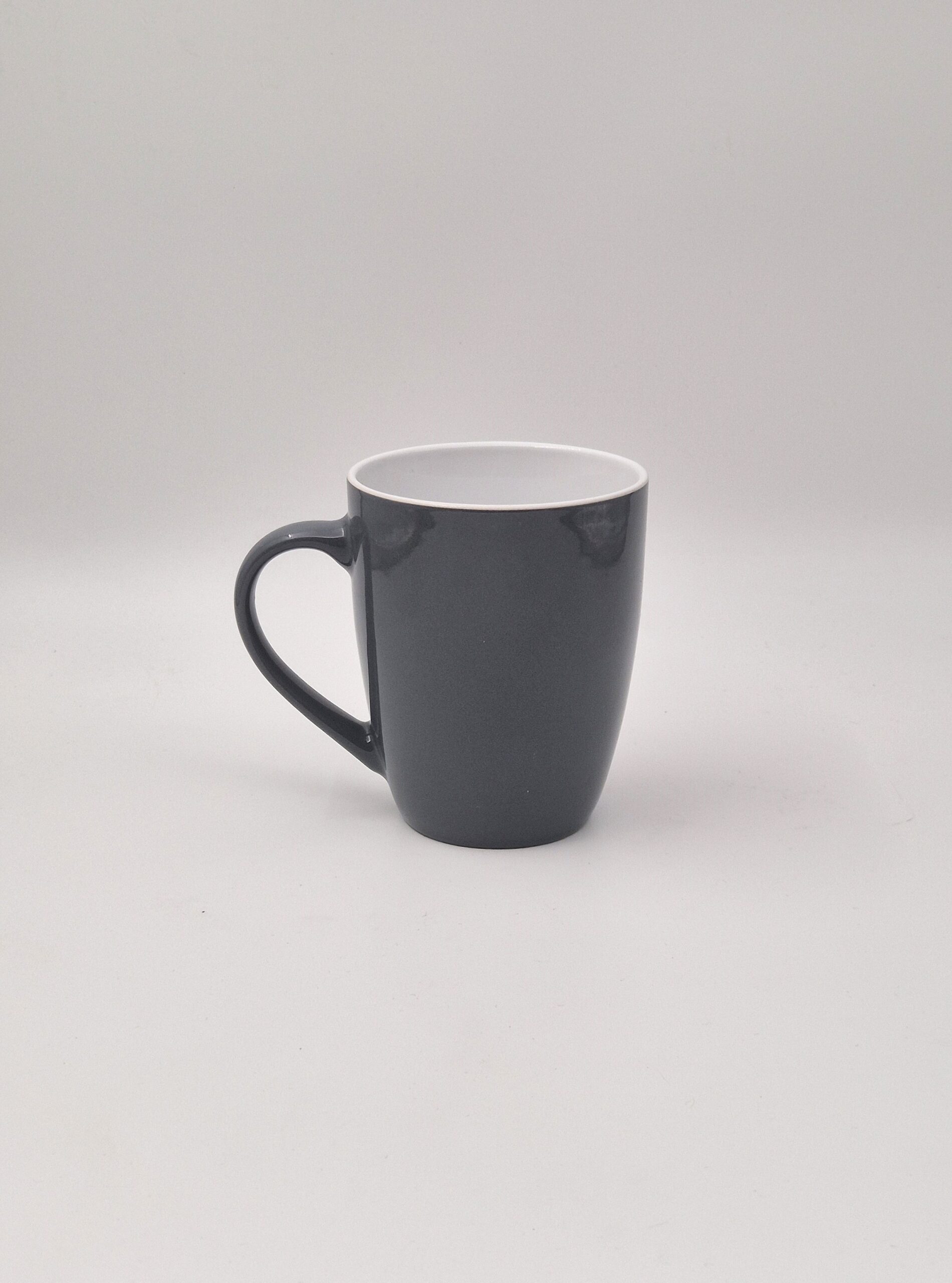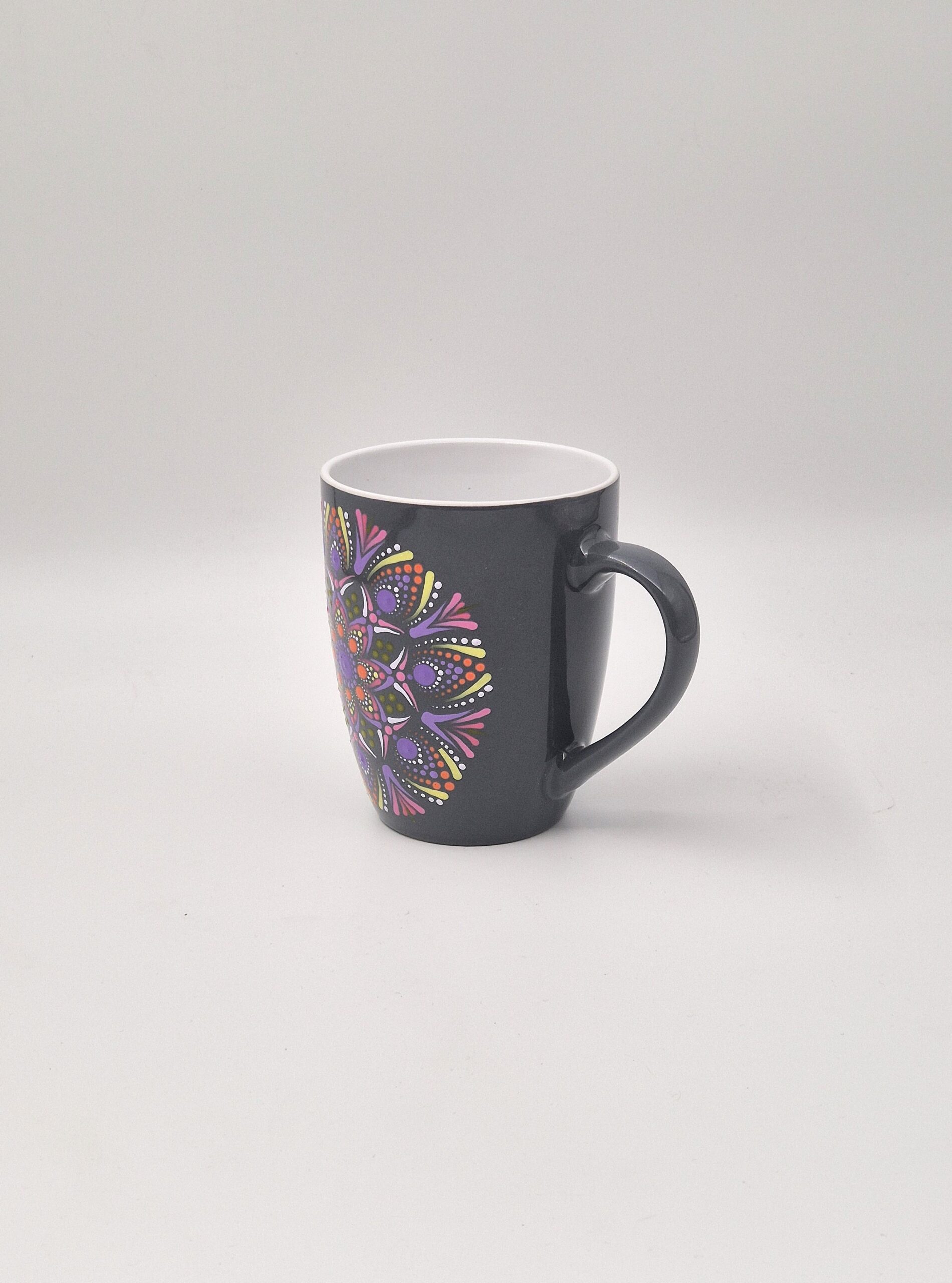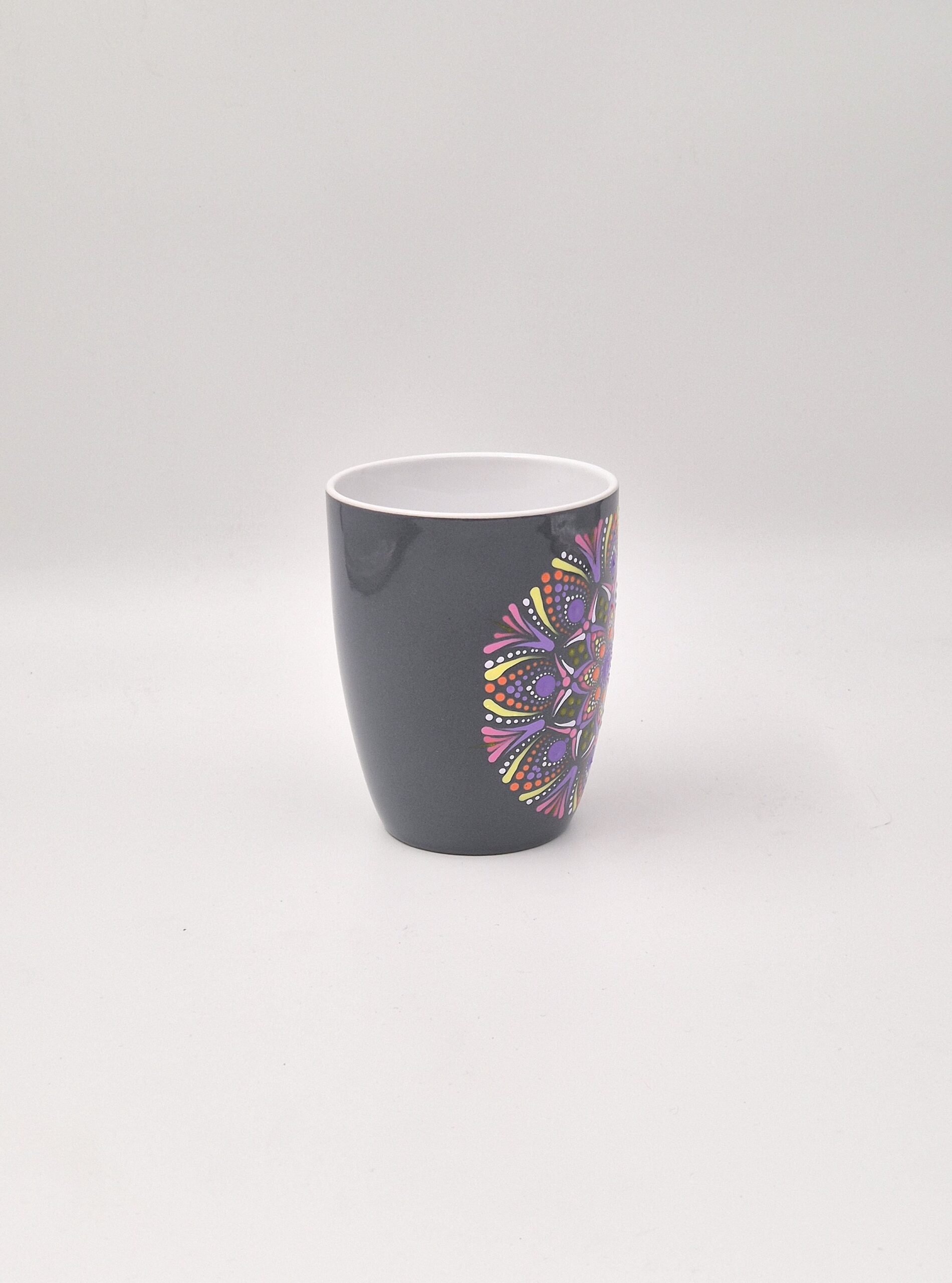 Ročno poslikan temno siv lonček, ki prinaša mir (siva), spiritualnost (vijolična) in vitalnost (oranžna/rumena).