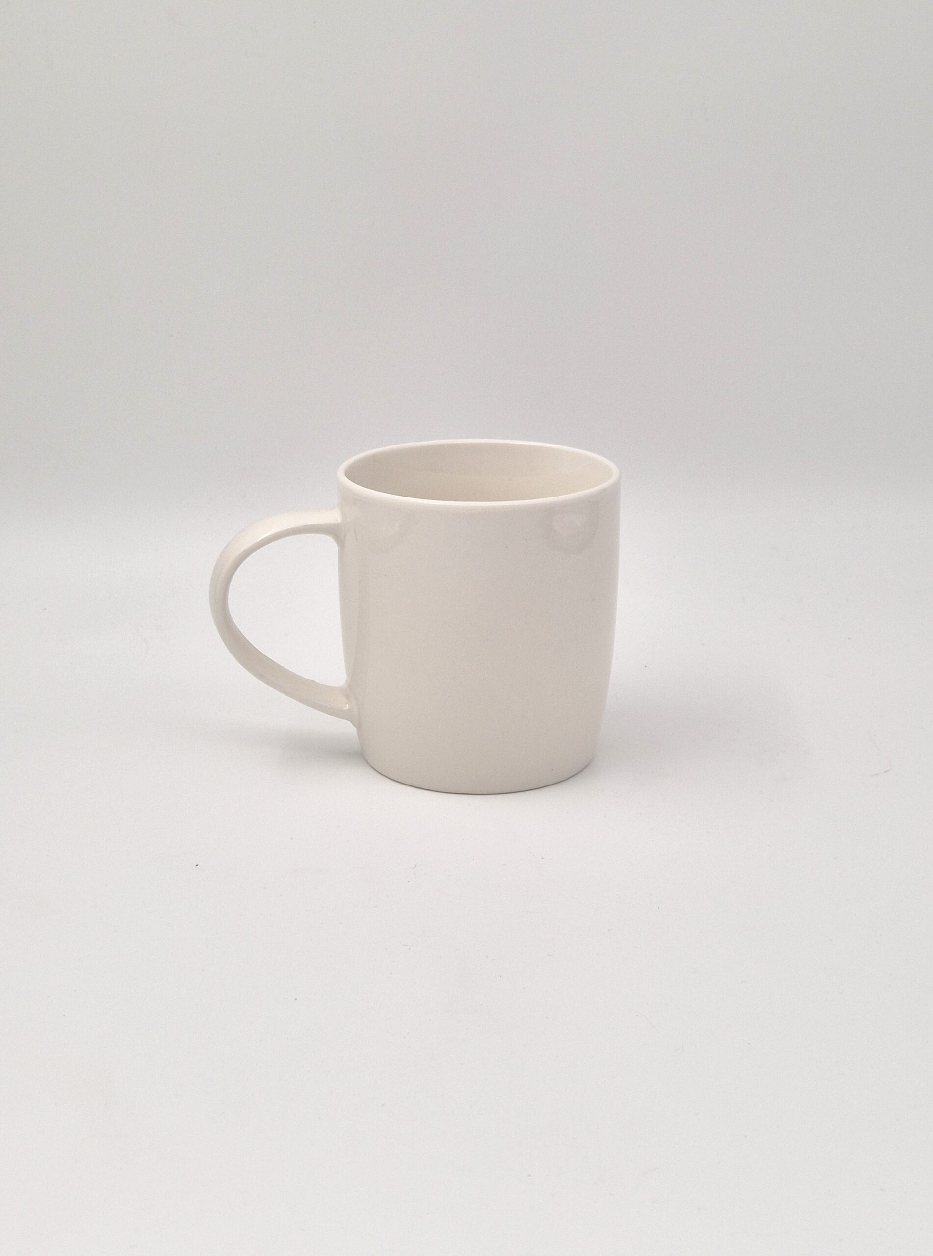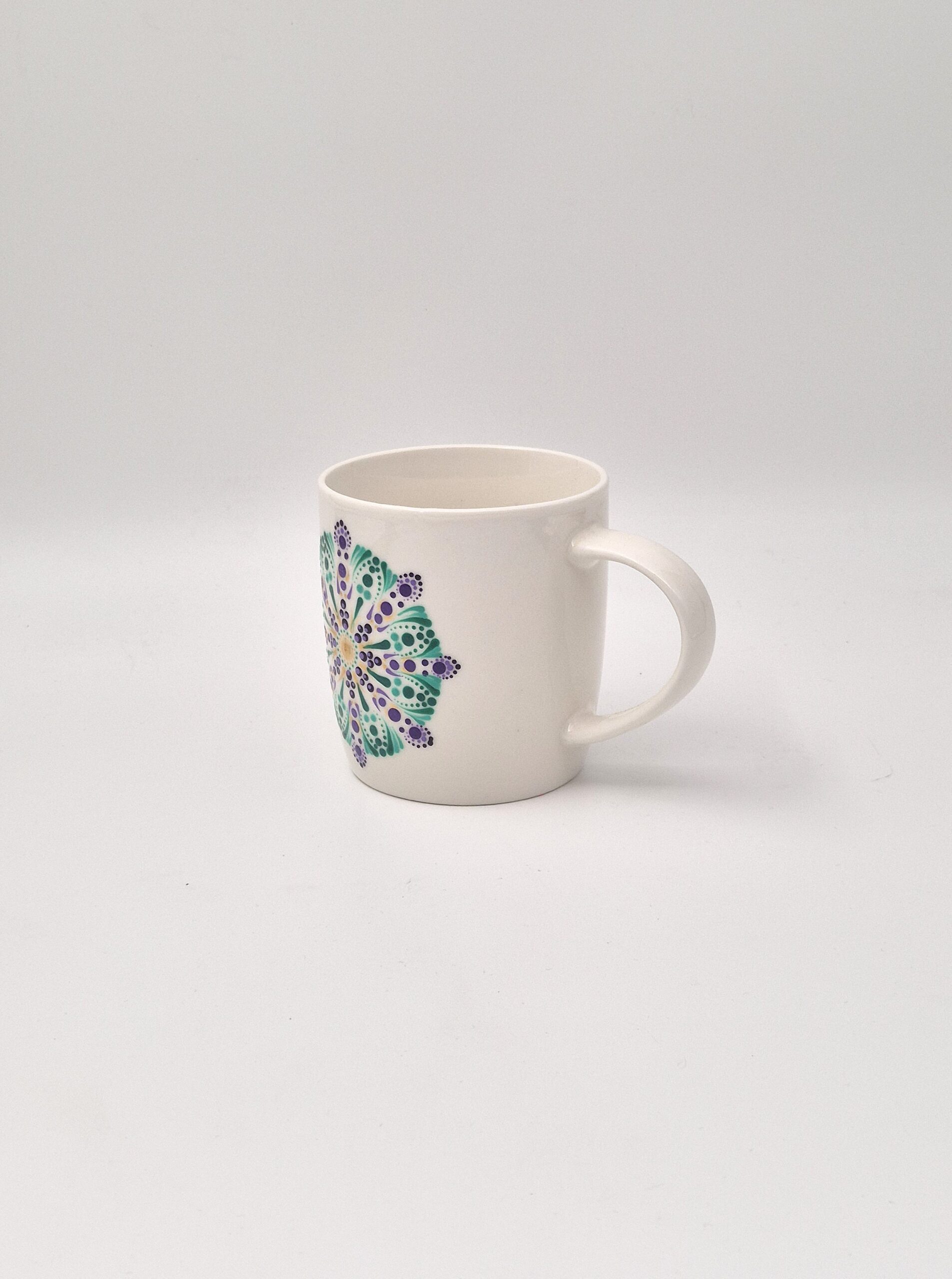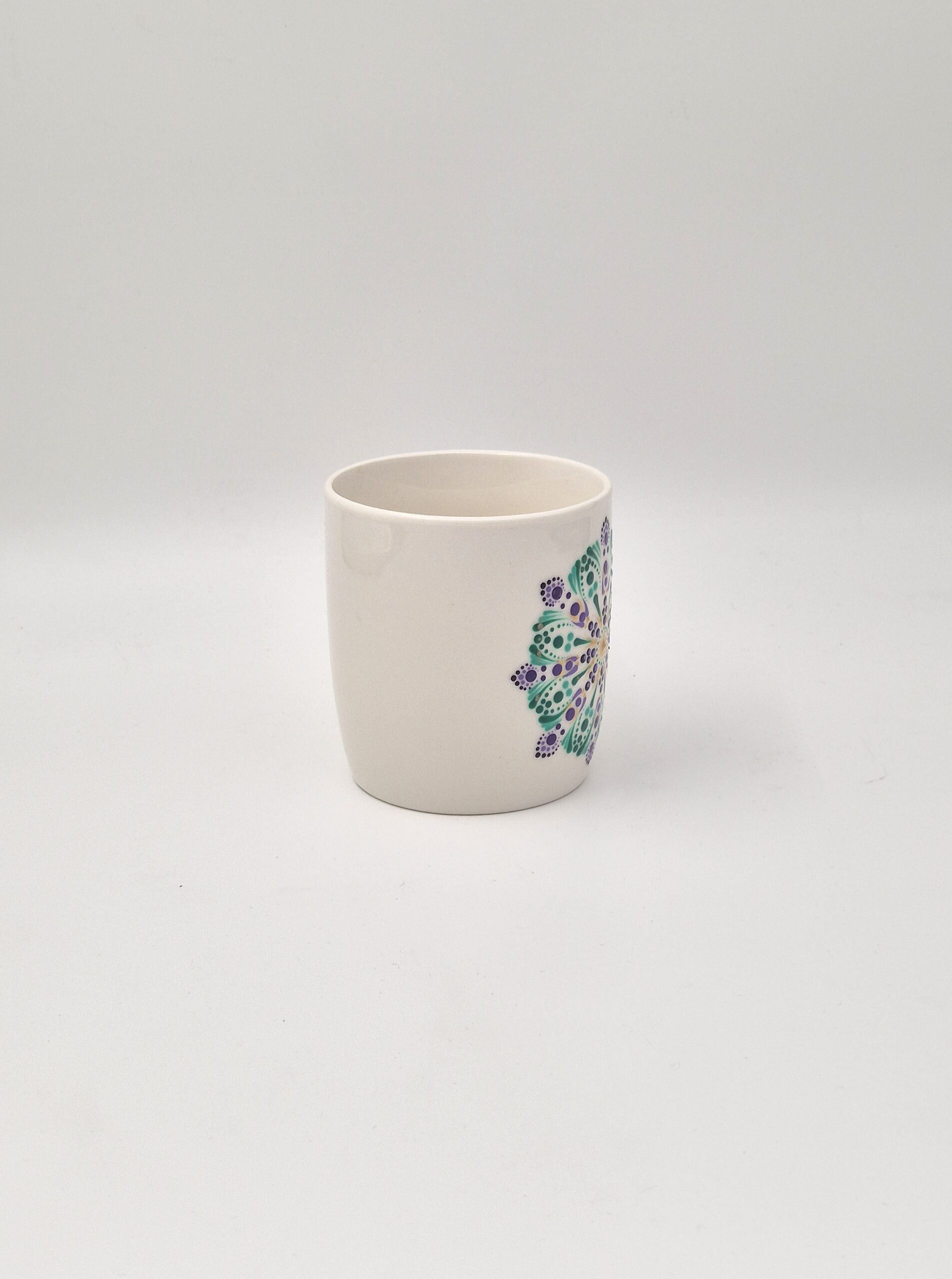 Ročno poslikan beli lonček, ki združuje spiritualni vpogled (vijolična) in srčno harmonijo (zelena).