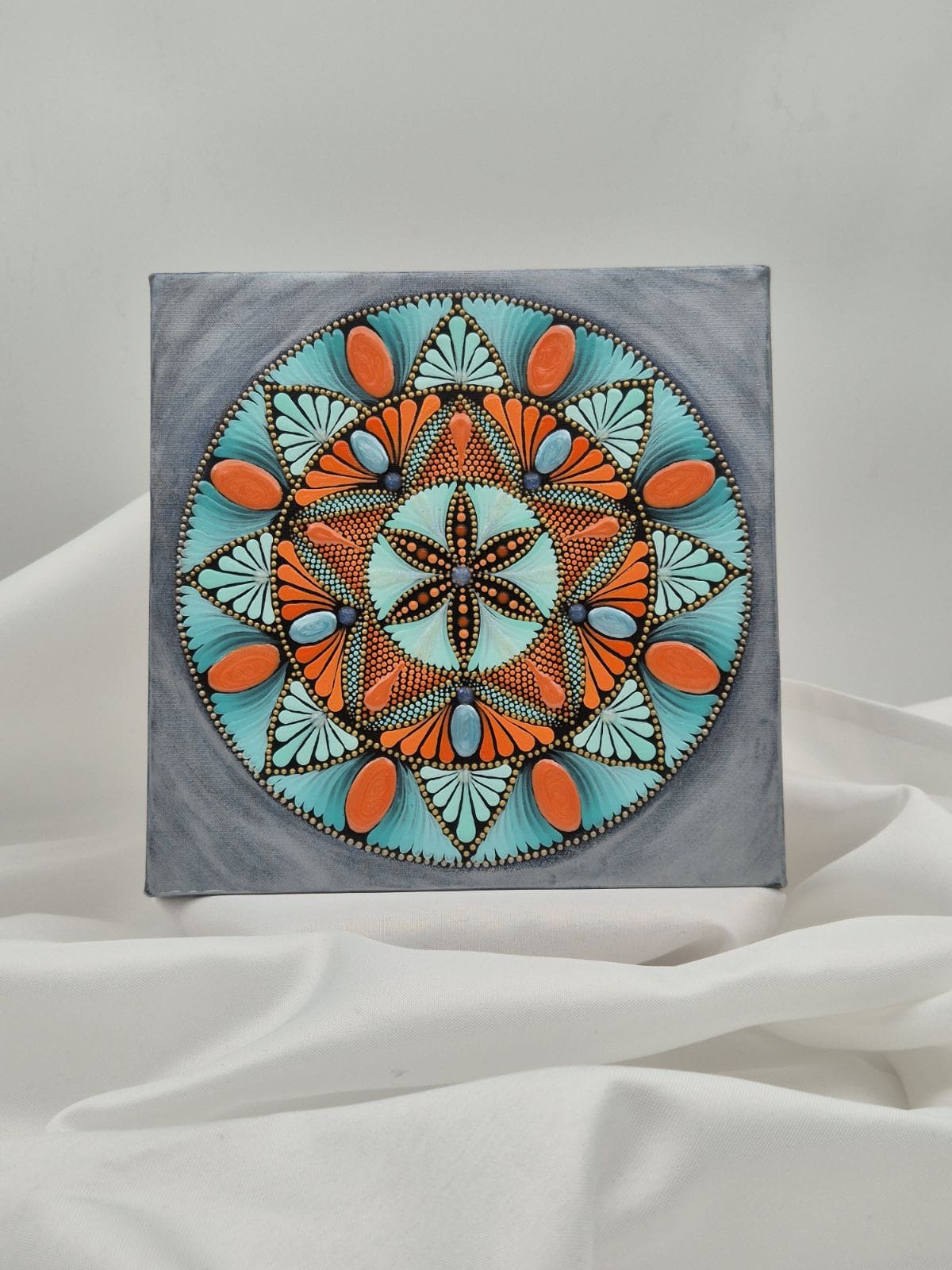 “Ko sem ustvarjala to ‘Mandalo Dom oltar’, sem čutila, kako se oranžna in turkizna prepletata kot toplina ognjišča in svežina jasnega neba. Oranžna mi je prinesla veselje in ustvarjalnost, turkizna pa me je opomnila na mir in jasnost, ki ju potrebujemo v svojem svetišču. Z vsako piko sem želela ujeti tisto vibracijo obilja in harmonije, ki jo prinaša dom, ustvarjen z ljubeznijo in namenom. Upam, da bo ta mandala tudi vam pomagala ustvariti dom, ki bo resnično vaš oltar in vir navdiha.”