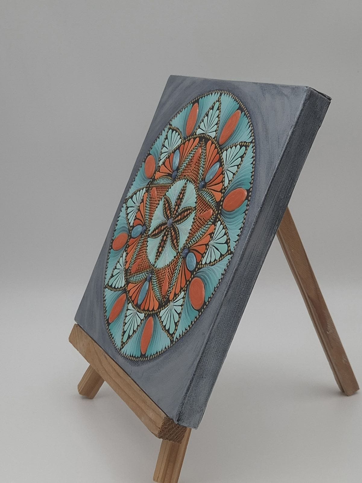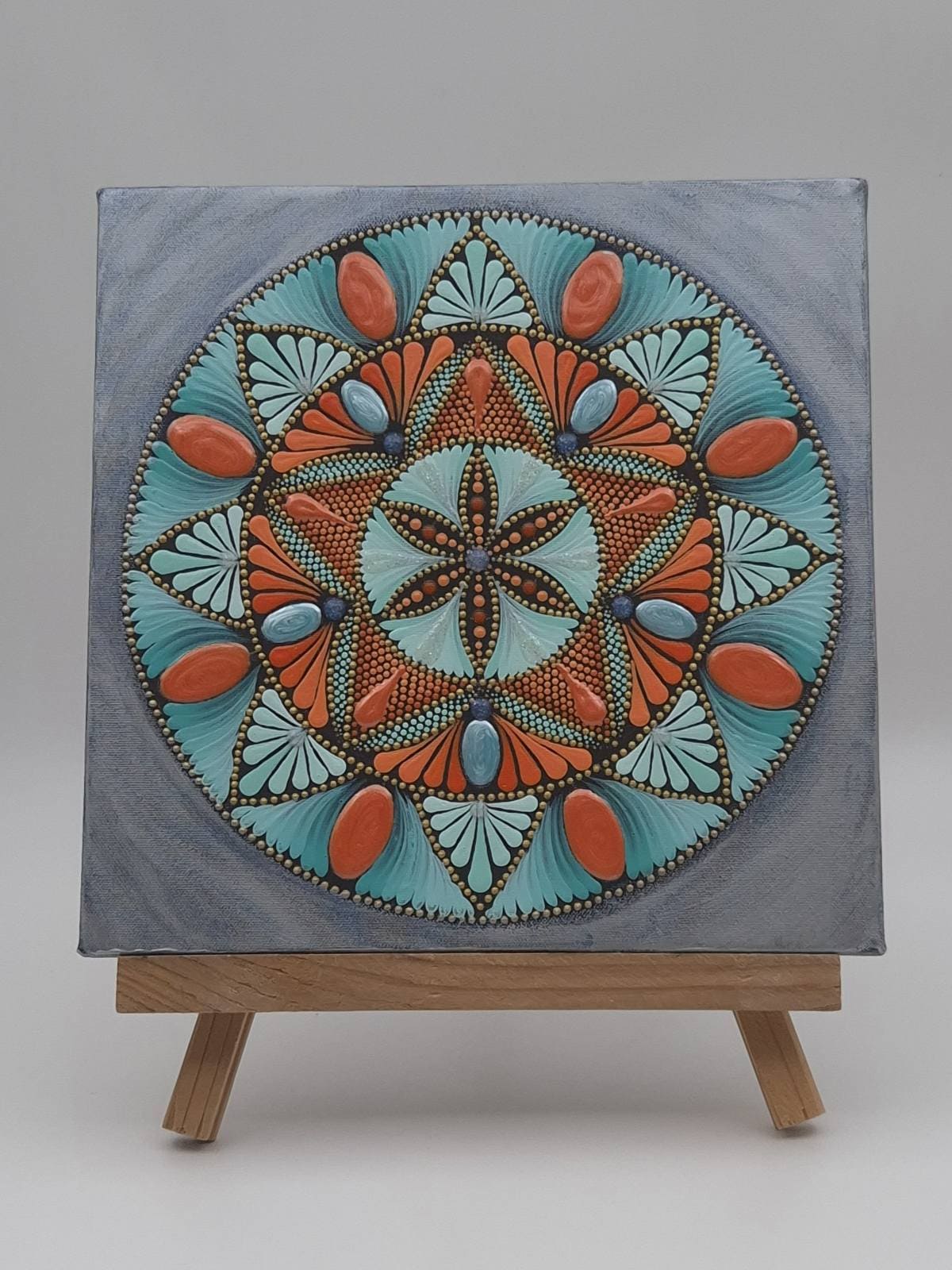 Ta ročno naslikana Mandala Dom oltar je živahna vizualna izkušnja, prežeta s toplimi oranžnimi in pomirjujočimi turkiznimi barvami. Vsaka pika je skrbno nanesena na platno in nosi močno energijo numerološkega zapisa 6.5.8., ki prepleta harmonijo doma, osebno svobodo in manifestacijo obilja.