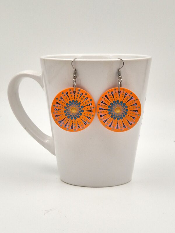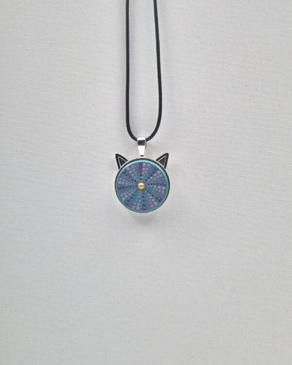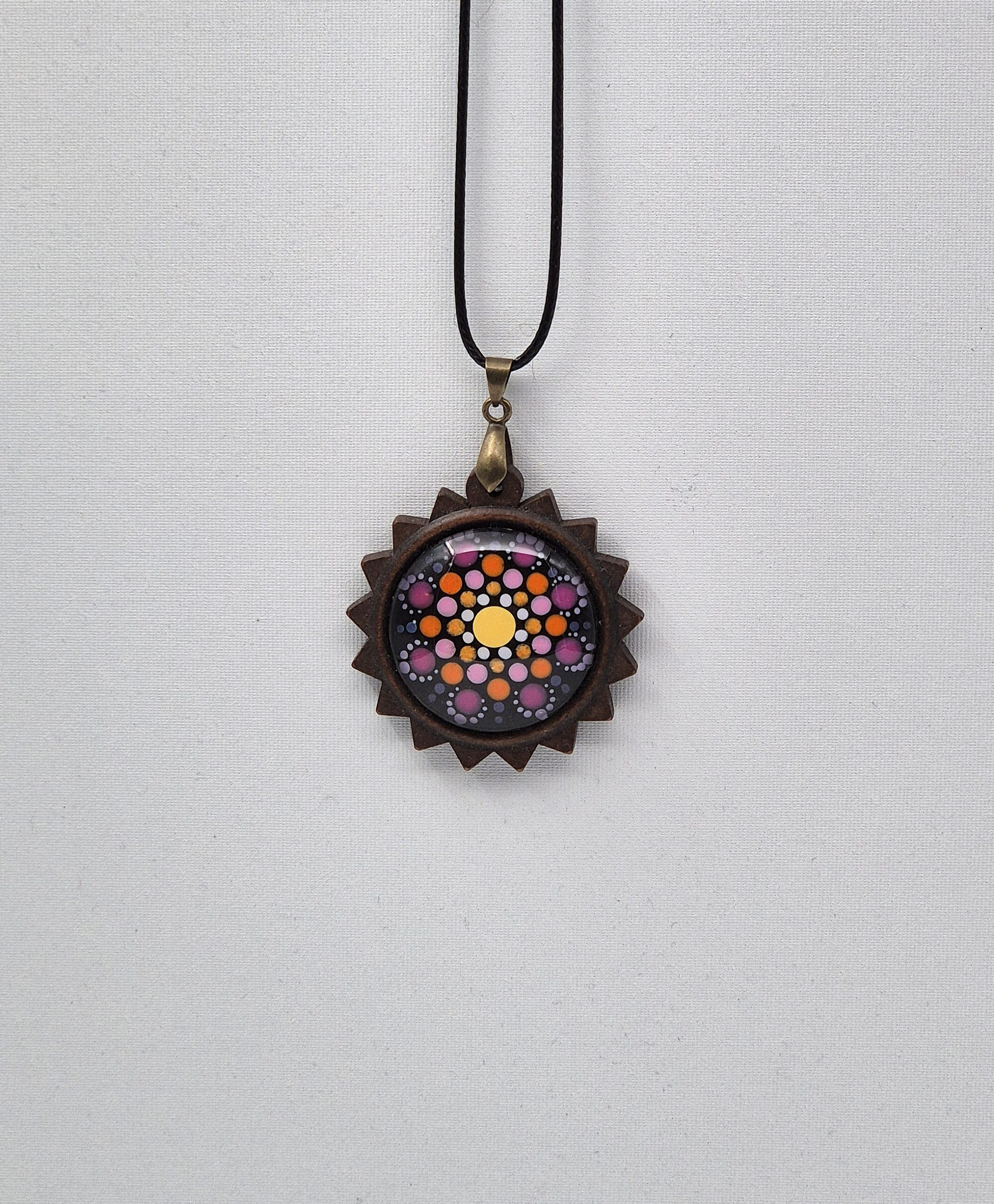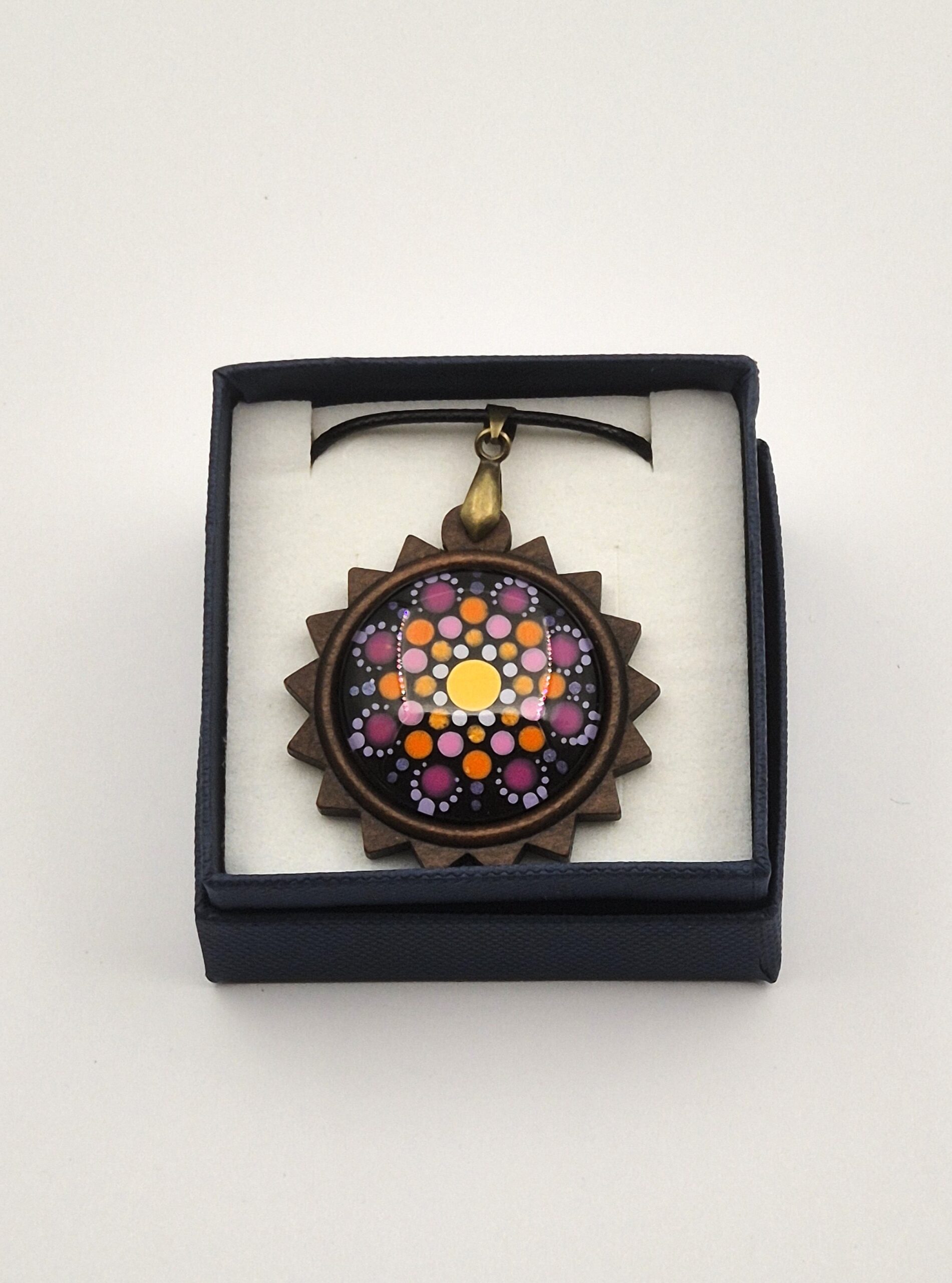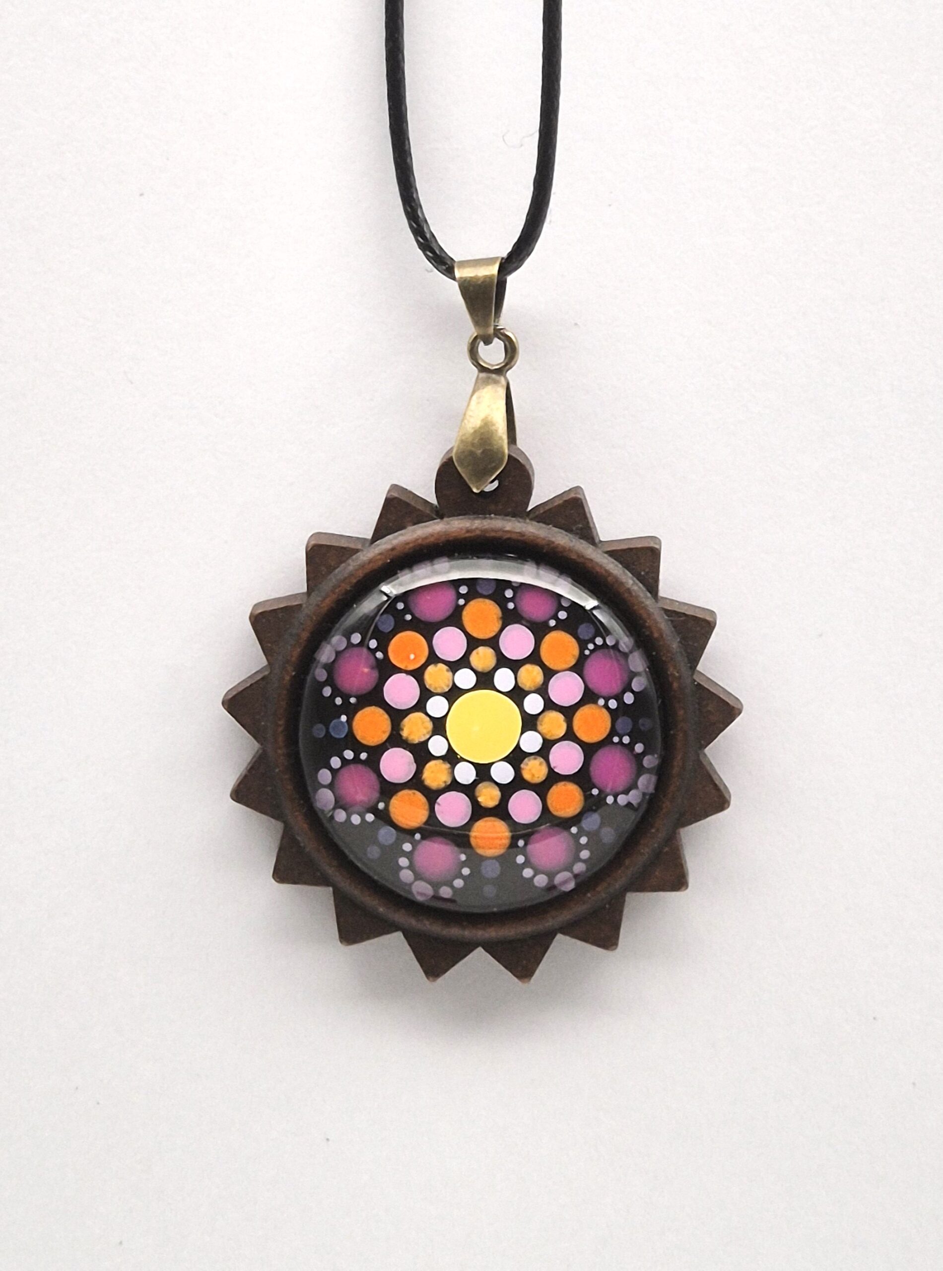 Ta unikatna ogrlica je poklon toplini in nežnim vezem, ki nas povezujejo. Mandala naklonjenosti združuje sončno rumeno, energično oranžno in ljubečo roza barvo, ki skupaj ustvarjajo harmonijo radosti in srčnosti. Natančna poslikava v tehniki pikanja je nanesena na naravno leseno osnovo, čez katero je položeno steklo, ki barvam doda izjemno globino, sijaj in pridih dragocenosti.
